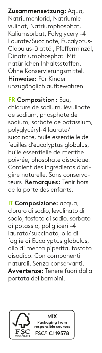 Aqua, Natriumchlorid, Natriumlevulinat, Natriumphosphat, Kaliumsorbat, Polyglyceryl-4 Laurate/Succinate, Eucalyptus- Globulus-Blattöl, Pfefferminzöl, Dinatriumphosphat. Mit natürlichen Inhaltsstoffen.