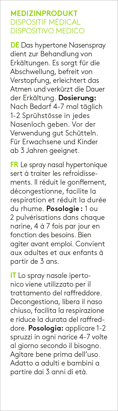 Das hypertone Nasenspray dient zur Behandlung von Erkältungen. Es sorgt für die Abschwellung, befreit von Verstopfung, erleichtert das Atmen und verkürzt die Dauer der Erkältung.