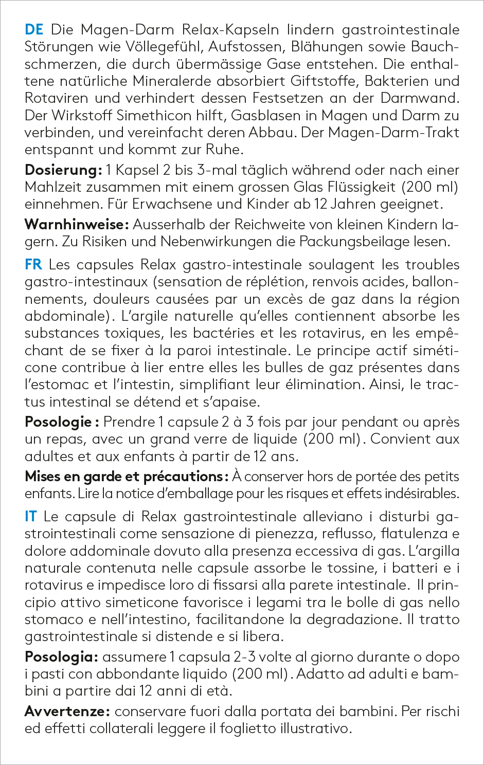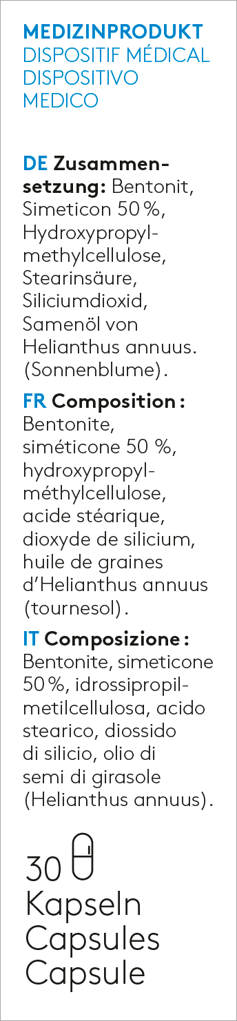 Die Magen-Darm Relax-Kapseln lindern gastrointestinale Störungen wie Völlegefühl, Aufstossen, Blähungen sowie Bauchschmerzen, die durch übermässige Gase entstehen. Die enthaltene natürliche Mineralerde absorbiert Giftstoffe, Bakterien und Rotaviren und verhindert dessen Festsetzen an der Darmwand. Der Wirkstoff Simethicon hilft, Gasblasen in Magen und Darm zu verbinden, und vereinfacht deren Abbau. Der Magen-Darm-Trakt entspannt und kommt zur Ruhe.