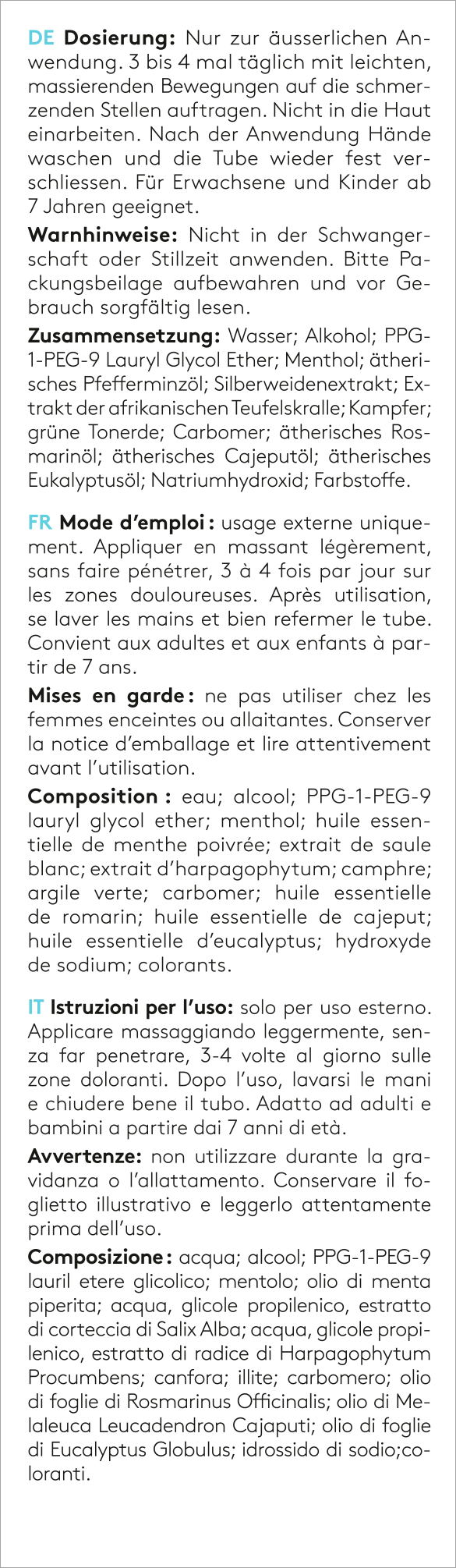 Wasser; Alkohol; PPG- 1-PEG-9 Lauryl Glycol Ether; Menthol; ätherisches Pfefferminzöl; Silberweidenextrakt; Extrakt der afrikanischen Teufelskralle; Kampfer; grüne Tonerde; Carbomer; ätherisches Rosmarinöl; ätherisches Cajeputöl; ätherisches Eukalyptusöl; Natriumhydroxid; Farbstoffe.