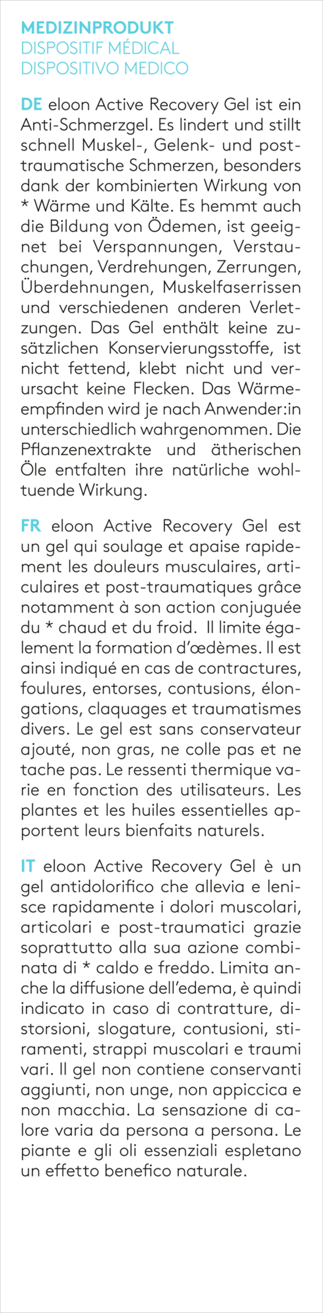 eloon Active Recovery Gel ist ein Anti-Schmerzgel. Es lindert und stillt schnell Muskel-, Gelenk- und posttraumatische Schmerzen, besonders dank der kombinierten Wirkung von *Wärme und Kälte. Es hemmt auch die Bildung von Ödemen, ist geeignet bei Verspannungen, Verstauchungen, Verdrehungen, Zerrungen, Überdehnungen, Muskelfaserrissen und verschiedenen anderen Verletzungen. Das Gel enthält keine zusätzlichen Konservierungsstoffe, ist nicht fettend, klebt nicht und verursacht keine Flecken. Das Wärmeempfinden wird je nach Anwender:in unterschiedlich wahrgenommen. Die Pflanzenextrakte und ätherischen Öle entfalten ihre natürliche wohltuende Wirkung.