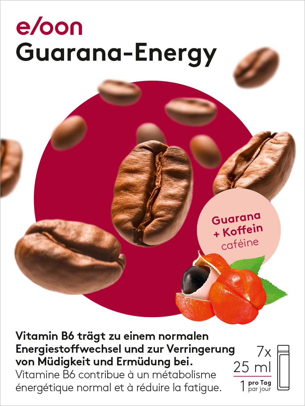 Wachheit, Antrieb, Power und hohe Konzentrationsfähigkeit sind wichtig im Beruf, Sport und Alltag. eloon Guarana-Energy enthält hoch dosiertes Koffein aus natürlichem Guaranasamen-Extrakt und zugesetztem Koffein. Die 5 B-Vitamine ergänzen das Produkt optimal. Geschmack: Cola-Orange.