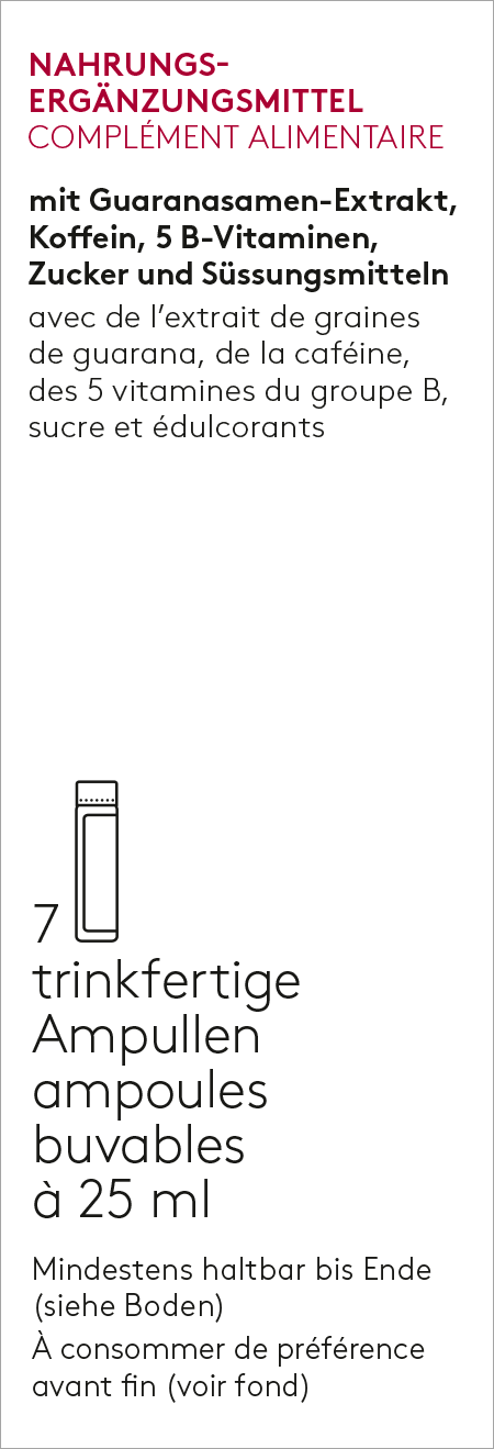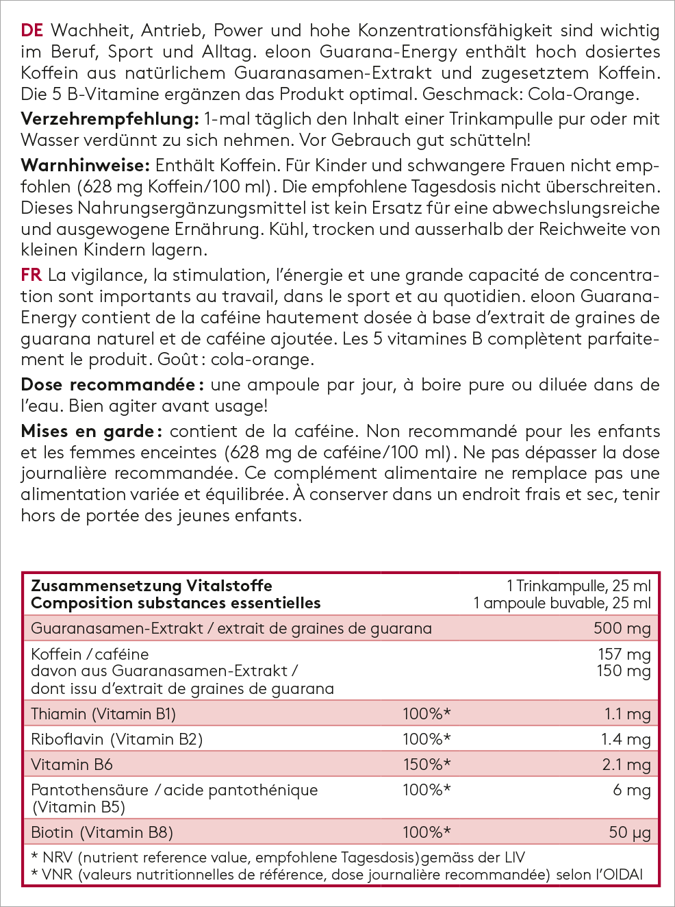 Enthält Koffein. Für Kinder und schwangere Frauen nicht empfohlen (628 mg Koffein/100 ml). Die empfohlene Tagesdosis nicht überschreiten. Dieses Nahrungsergänzungsmittel ist kein Ersatz für eine abwechslungsreiche und ausgewogene Ernährung. Kühl, trocken und ausserhalb der Reichweite von kleinen Kindern lagern.