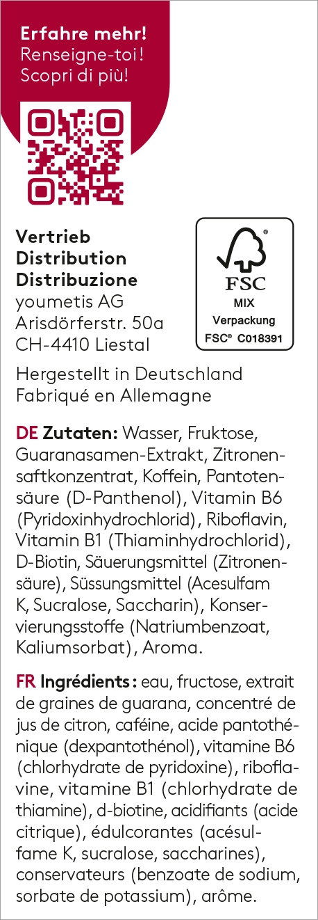 Wasser, Fruktose, Guaranasamen-Extrakt, Zitronensaftkonzentrat, Koffein, Pantotensäure (D-Panthenol), Vitamin B6 (Pyridoxinhydrochlorid), Riboflavin, Vitamin B1 (Thiaminhydrochlorid), D-Biotin, Säuerungsmittel (Zitronensäure), Süssungsmittel (Acesulfam K, Sucralose, Saccharin), Konservierungsstoffe (Natriumbenzoat, Kaliumsorbat), Aroma.
