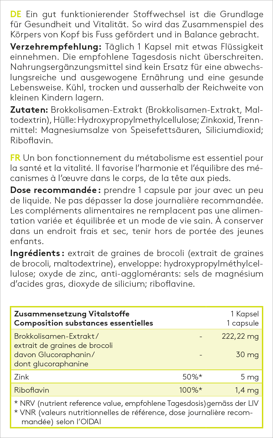 Brokkolisamen-Extrakt (Brokkolisamen-Extrakt, Maltodextrin), Hülle: Hydroxypropylmethylcellulose; Zinkoxid, Trennmittel: Magnesiumsalze von Speisefettsäuren, Siliciumdioxid; Riboflavin.