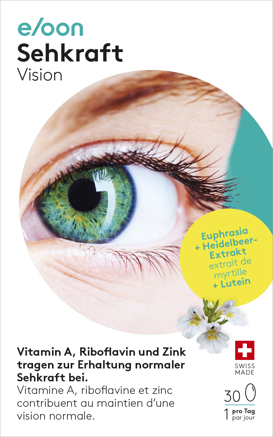 eloon Sehkraft pflegt die Augen von innen und verbessert das Sehvermögen. Es reduziert Augenreizungen, schützt vor Gesundheitseinflüssen und filtert das Licht von Handy- und Computerbildschirme für ein gesundes Auge.