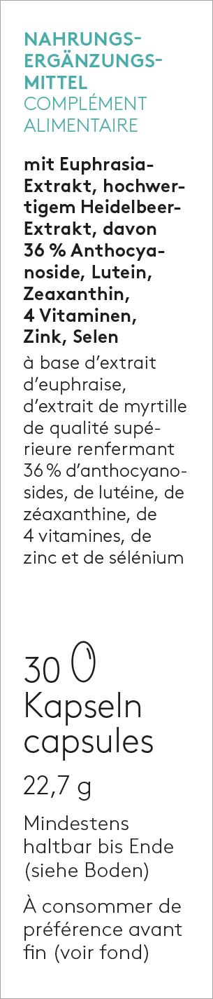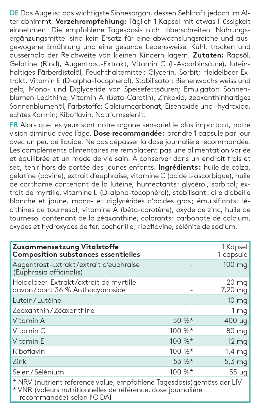 Rapsöl, Gelatine (Rind), Augentrost-Extrakt, Vitamin C (L-Ascorbinsäure), luteinhaltiges Färberdistelöl, Feuchthaltemittel: Glycerin, Sorbit; Heidelbeer-Extrakt, Vitamin E (D-alpha-Tocopherol), Stabilisator: Bienenwachs weiss und gelb, Mono- und Diglyceride von Speisefettsäuren; Emulgator: Sonnenblumen-Lecithine; Vitamin A (Beta-Carotin), Zinkoxid, zeaxanthinhaltiges Sonnenblumenöl, Farbstoffe: Calciumcarbonat, Eisenoxide und -hydroxide, echtes Karmin; Riboflavin, Natriumselenit.