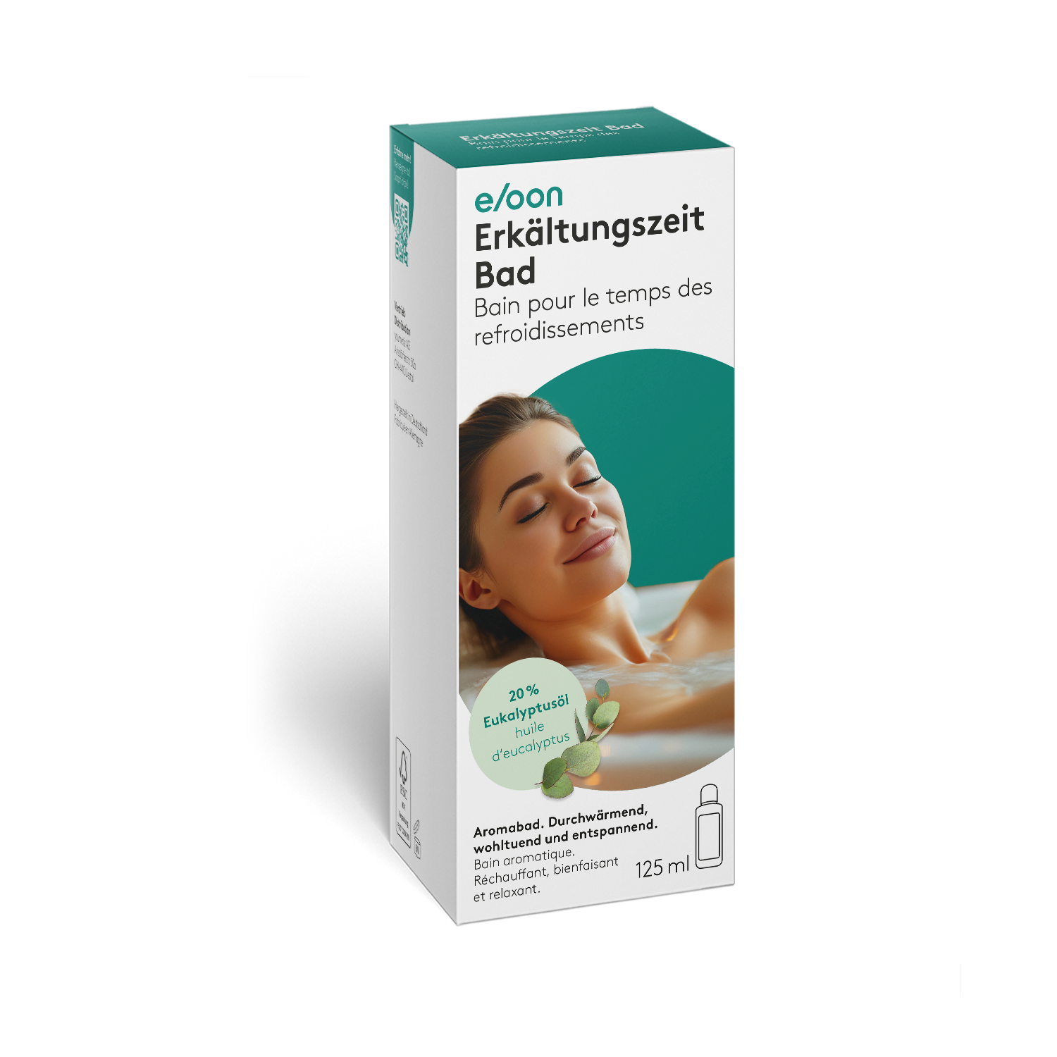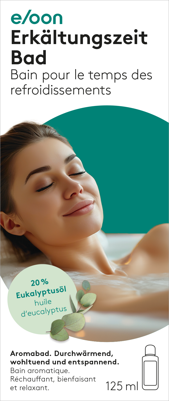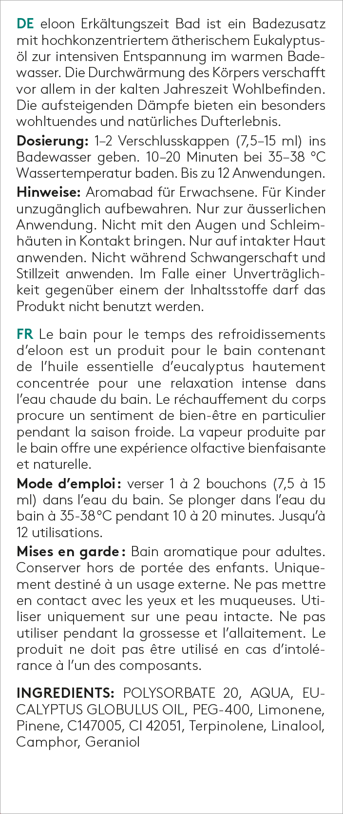 eloon Erkältungszeit Bad ist ein Badezusatz mit hochkonzentriertem ätherischem Eukalyptusöl zur intensiven Entspannung im warmen Badewasser. Die Durchwärmung des Körpers verschafft vor allem in der kalten Jahreszeit Wohlbefinden. Die aufsteigenden Dämpfe bieten ein besonders wohltuendes und natürliches Dufterlebnis.