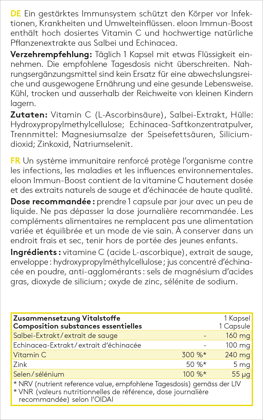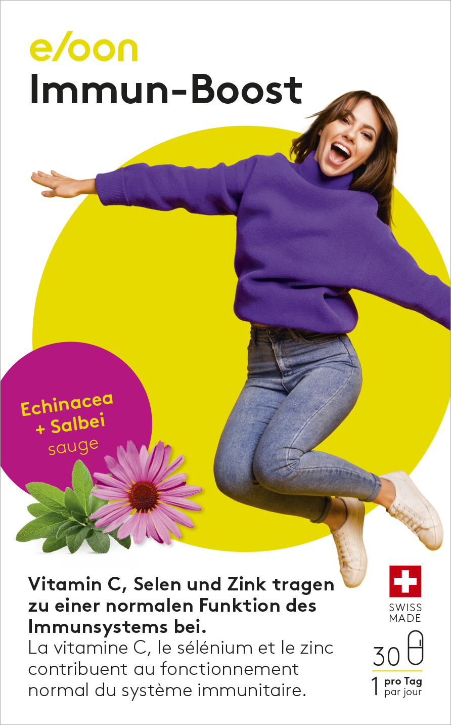 Ein gestärktes Immunsystem schützt den Körper vor Infektionen, Krankheiten und Umwelteinflüssen. eloon Immun-Boost enthält hoch dosiertes Vitamin C und hochwertige natürliche Pflanzenextrakte aus Salbei und Echinacea.