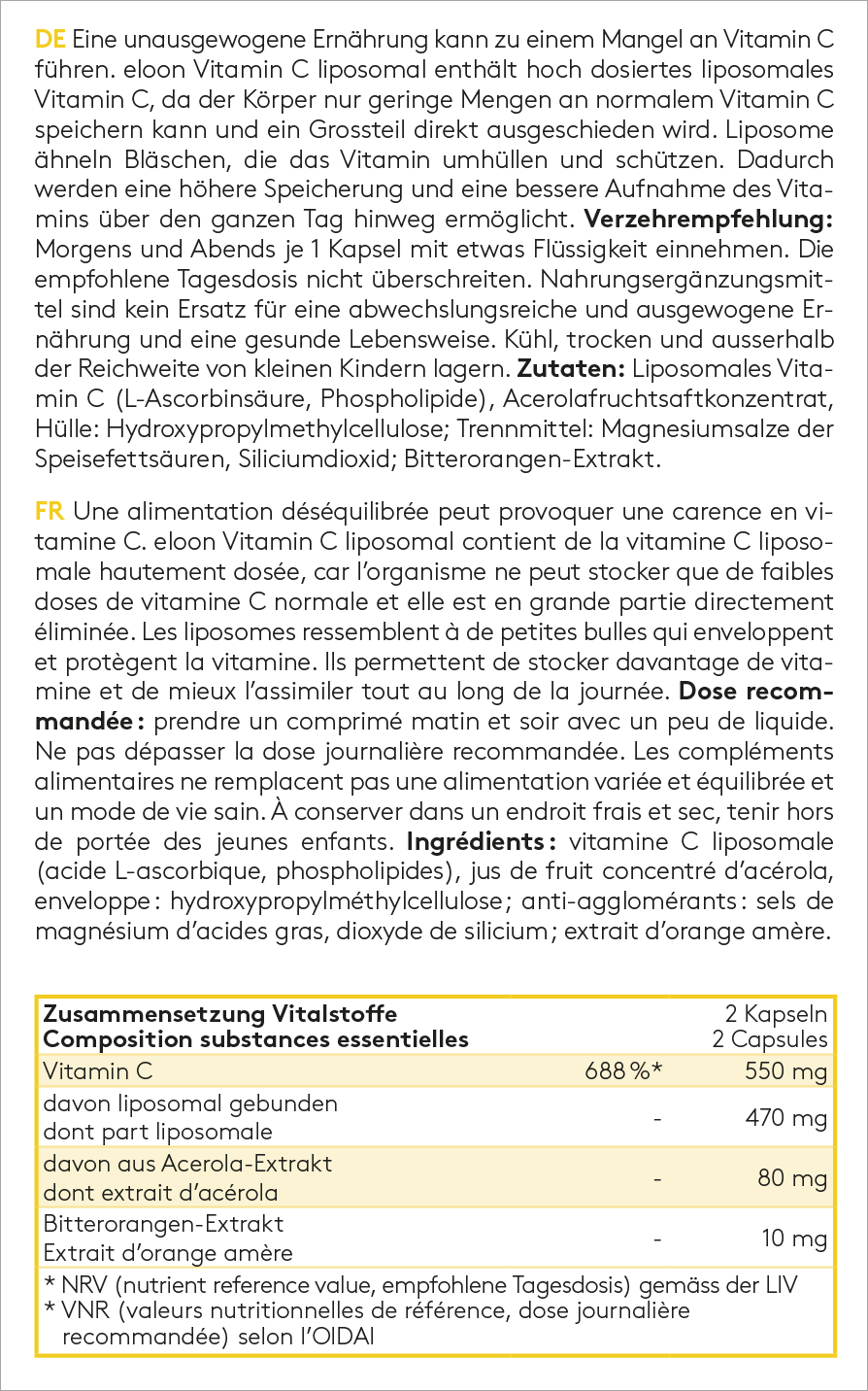 Eine unausgewogene Ernährung kann zu einem Mangel an Vitamin C führen. eloon Vitamin C liposomal enthält hoch dosiertes liposomales Vitamin C, da der Körper nur geringe Mengen an normalem Vitamin C speichern kann und ein Grossteil direkt ausgeschieden wird. Liposome ähneln Bläschen, die das Vitamin umhüllen und schützen. Dadurch werden eine höhere Speicherung und eine bessere Aufnahme des Vitamins über den ganzen Tag hinweg ermöglicht.