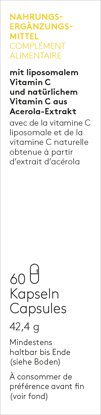 Liposomales Vitamin C (L-Ascorbinsäure, Phospholipide), Acerolafruchtsaftkonzentrat, Hülle: Hydroxypropylmethylcellulose; Trennmittel: Magnesiumsalze der Speisefettsäuren, Siliciumdioxid; Bitterorangen-Extrakt.