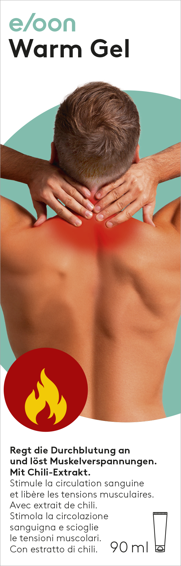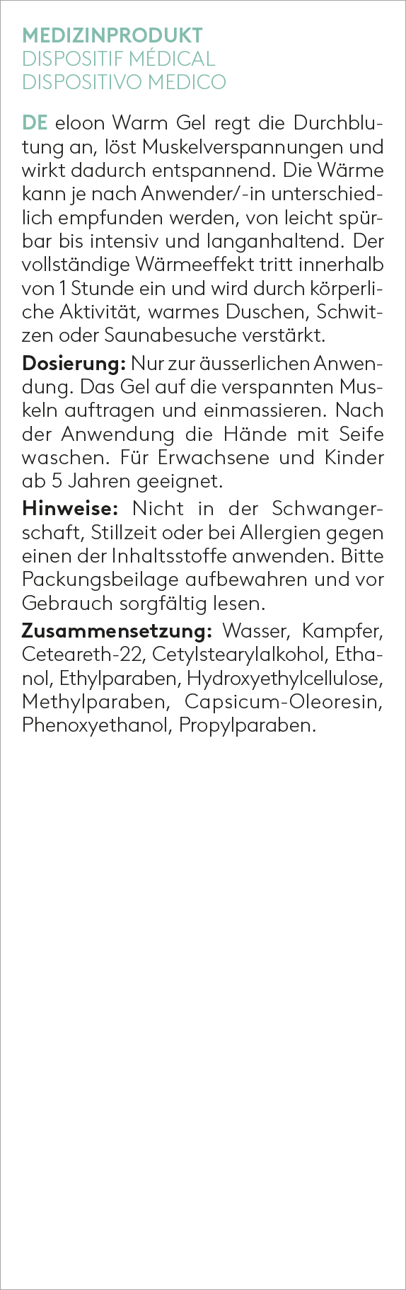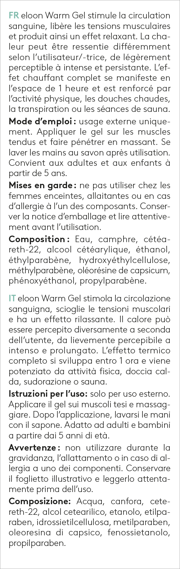eloon Warm Gel regt die Durchblutung an, löst Muskelverspannungen und wirkt dadurch entspannend. Die Wärme kann je nach Anwender/-in unterschiedlich empfunden werden, von leicht spürbar bis intensiv und langanhaltend. Der vollständige Wärmeeffekt tritt innerhalb von 1 Stunde ein und wird durch körperliche Aktivität, warmes Duschen, Schwitzen oder Saunabesuche verstärkt.