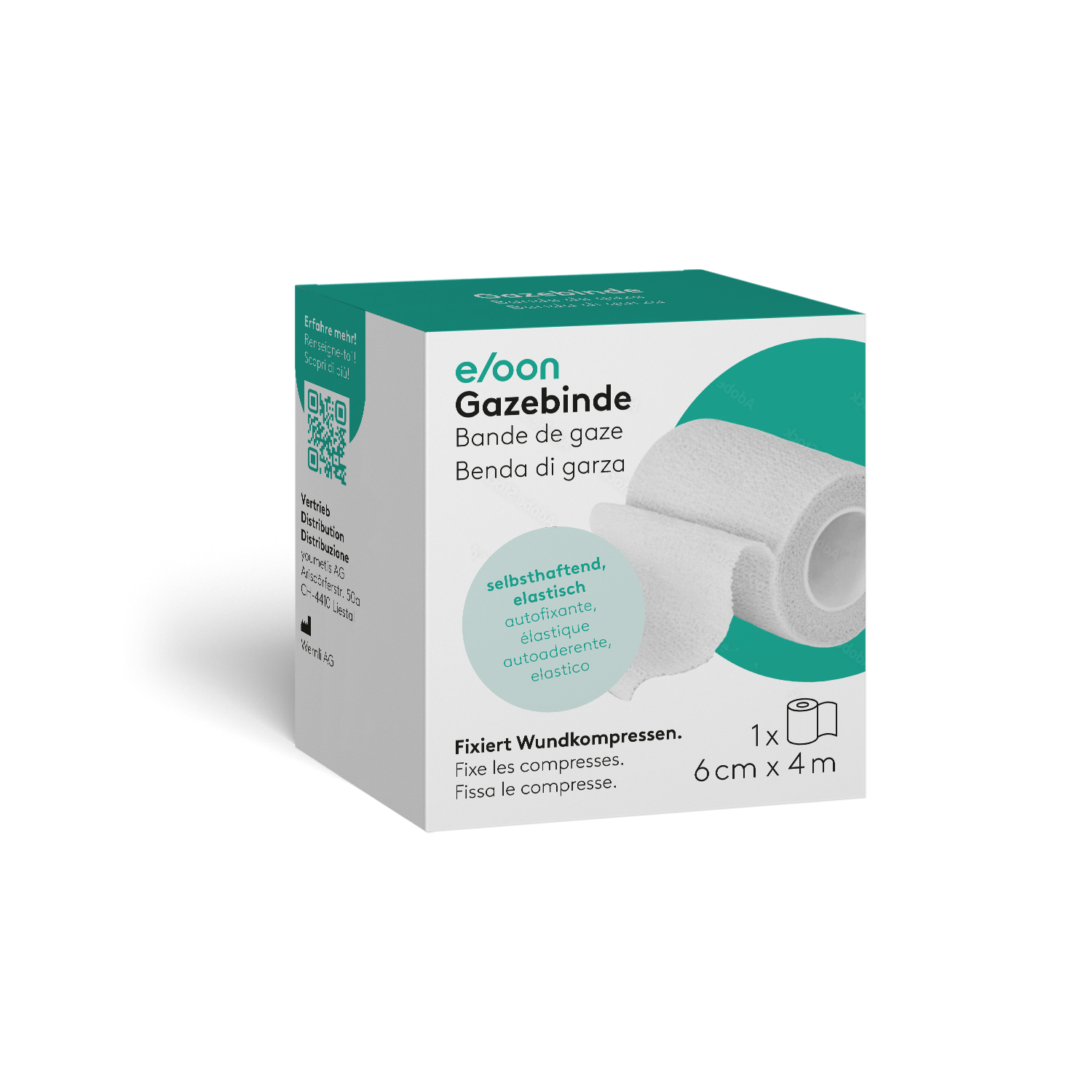 Die eloon Gazebinde wird gleichmässig und ohne zu starken Zug um die Wundauflage gewickelt, sodass diese sicher an Ort und Stelle bleibt. Da die Gazebinde selbsthaftend ist, braucht es kein zusätzliches Fixiermaterial. Das Ende wird sanft angedrückt – die Binde haftet zuverlässig an sich selbst.