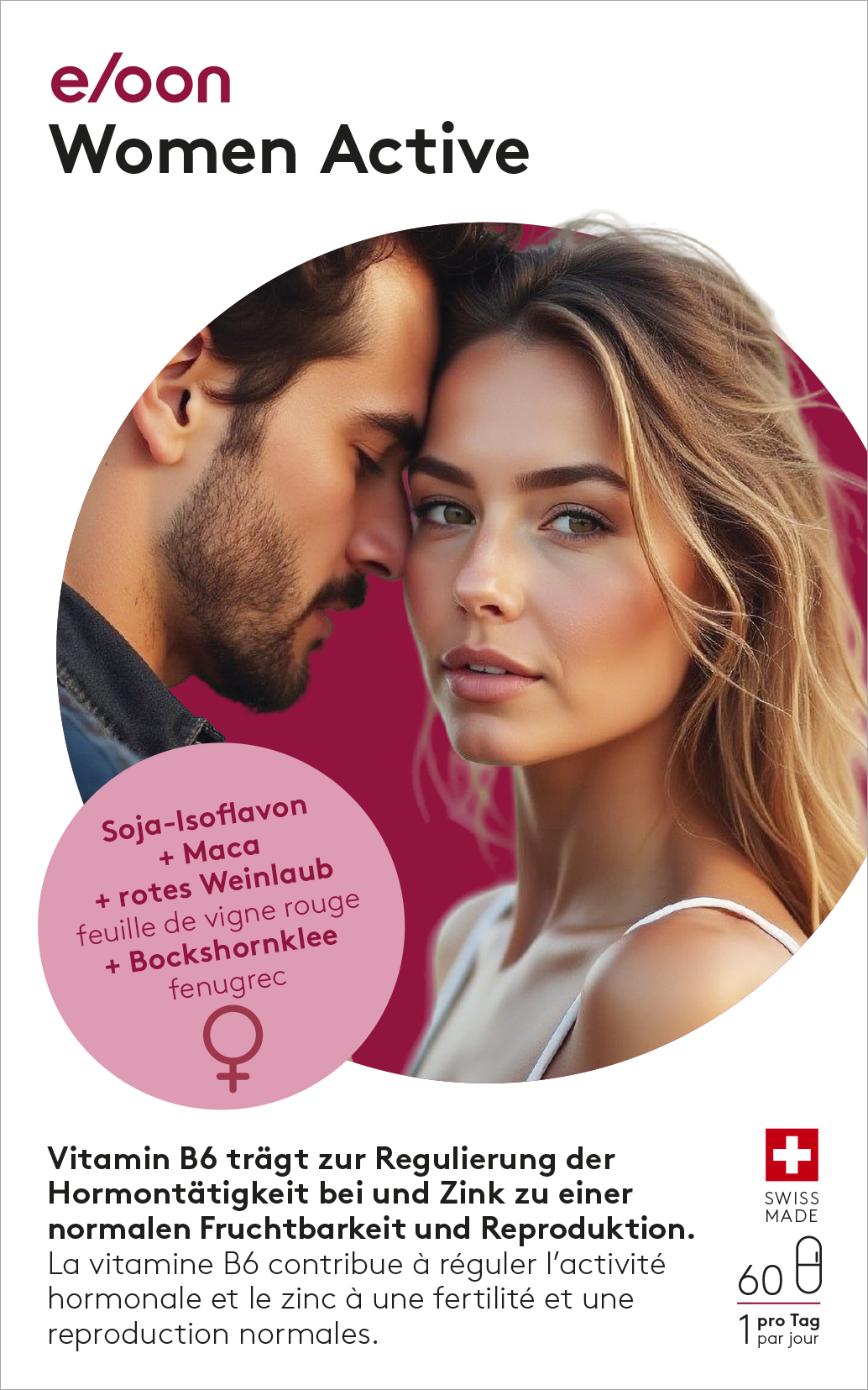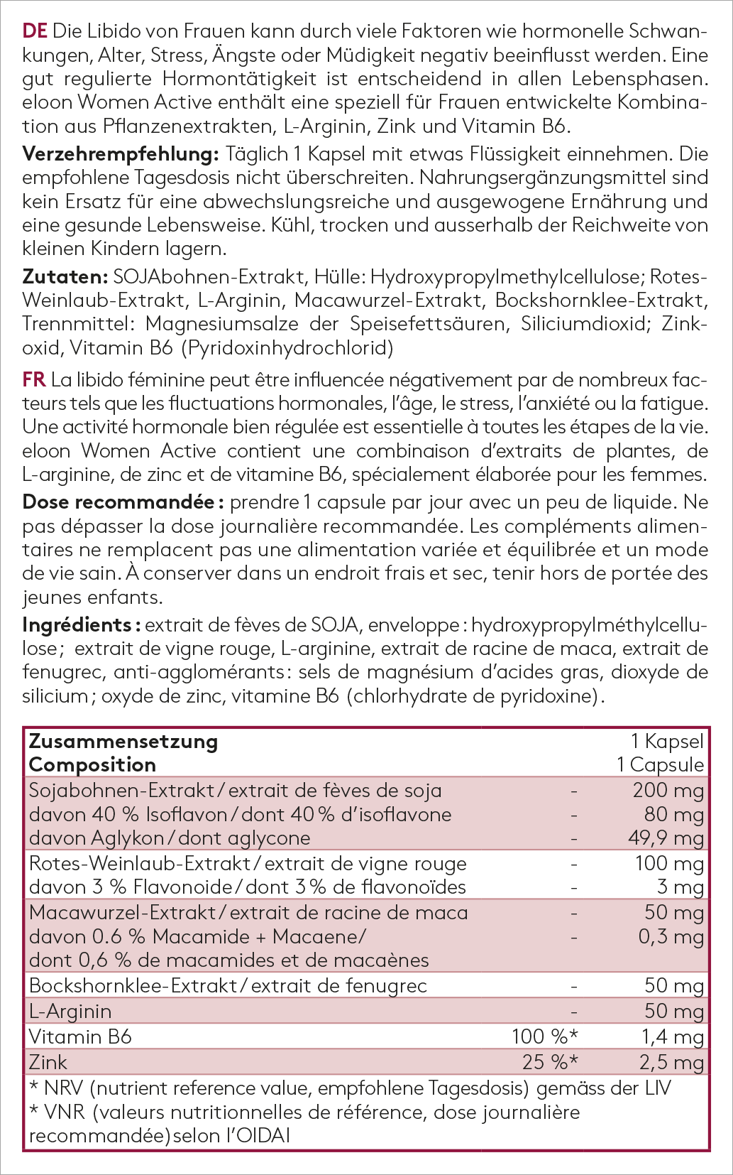 Die Libido von Frauen kann durch viele Faktoren wie hormonelle Schwankungen, Alter, Stress, Ängste oder Müdigkeit negativ beeinflusst werden. Eine gut regulierte Hormontätigkeit ist entscheidend in allen Lebensphasen. eloon Women Active enthält eine speziell für Frauen entwickelte Kombination aus Pflanzenextrakten, L-Arginin, Zink und Vitamin B6.